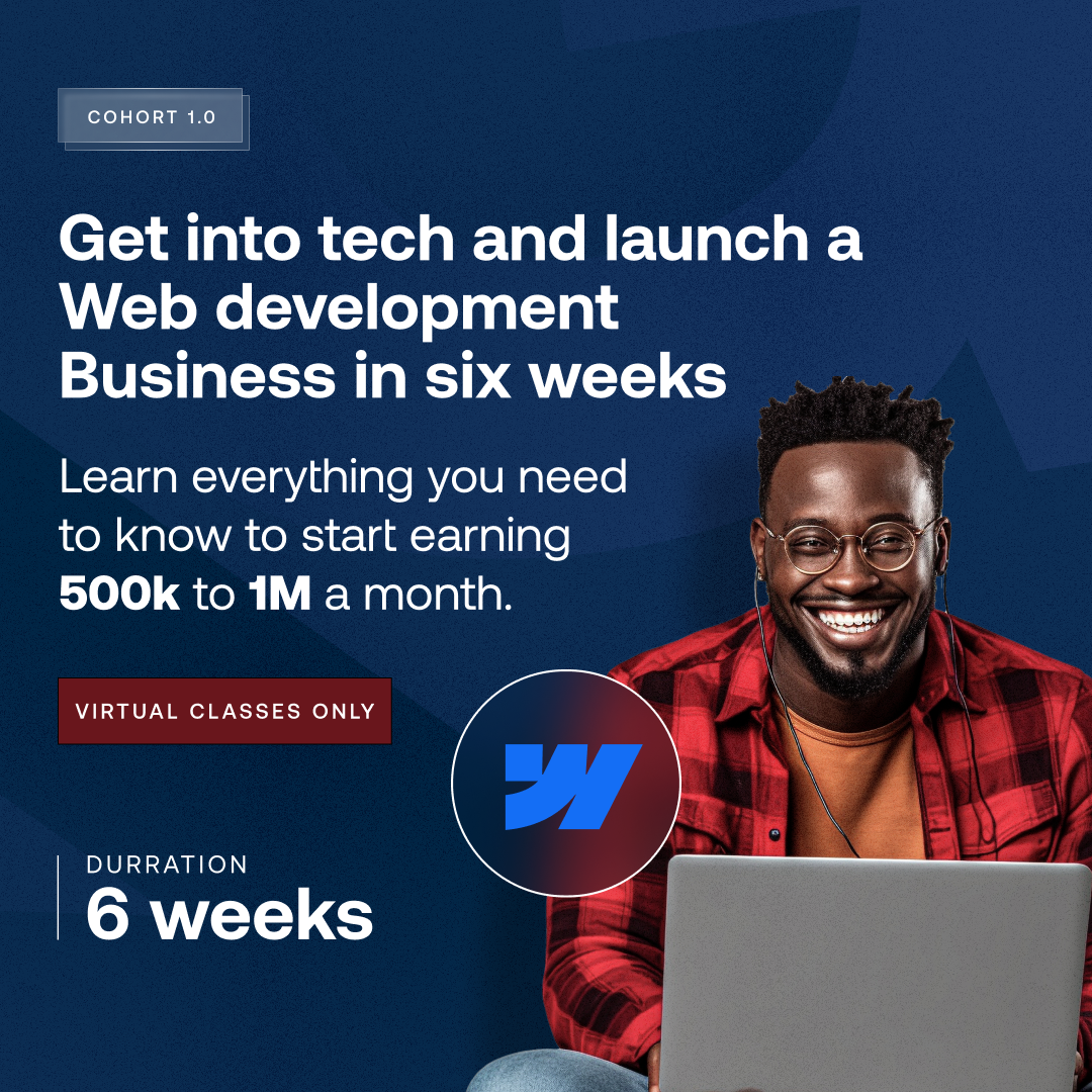 In just six weeks, learn everything you need to start earning ₦500,000 to ₦1,000,000 a month by launching your own web development business. Join our intensive and hands-on cohort, designed for aspiring tech entrepreneurs and those looking to break into the tech industry.